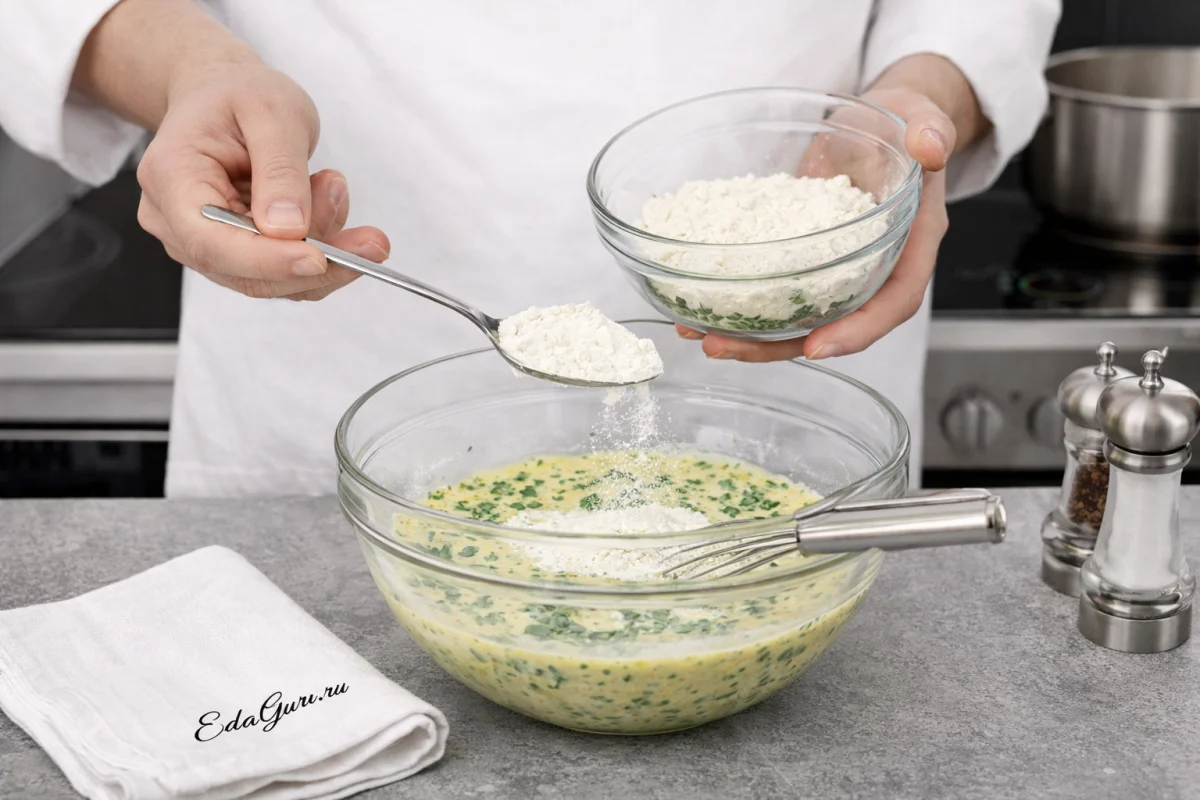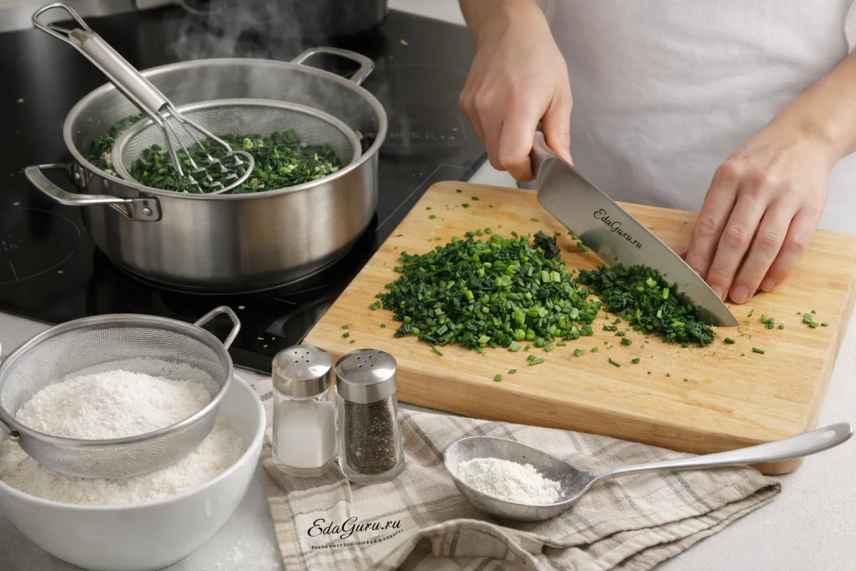 Зеленый лук измельчите. Отделите жесткие стебли зелени от листьев и хорошо промойте. Переложите листья в металлическое сито или дуршлаг и 0,5 мин. опустите в большую кастрюлю с кипящей водой — это быстрое бланширование сделает зелень мягче. Затем слегка отожмите листья лопаткой, выложите на доску и мелко порубите. Отдельно соедините разрыхлитель с мукой и просейте смесь через сито, чтобы она стала более воздушной.