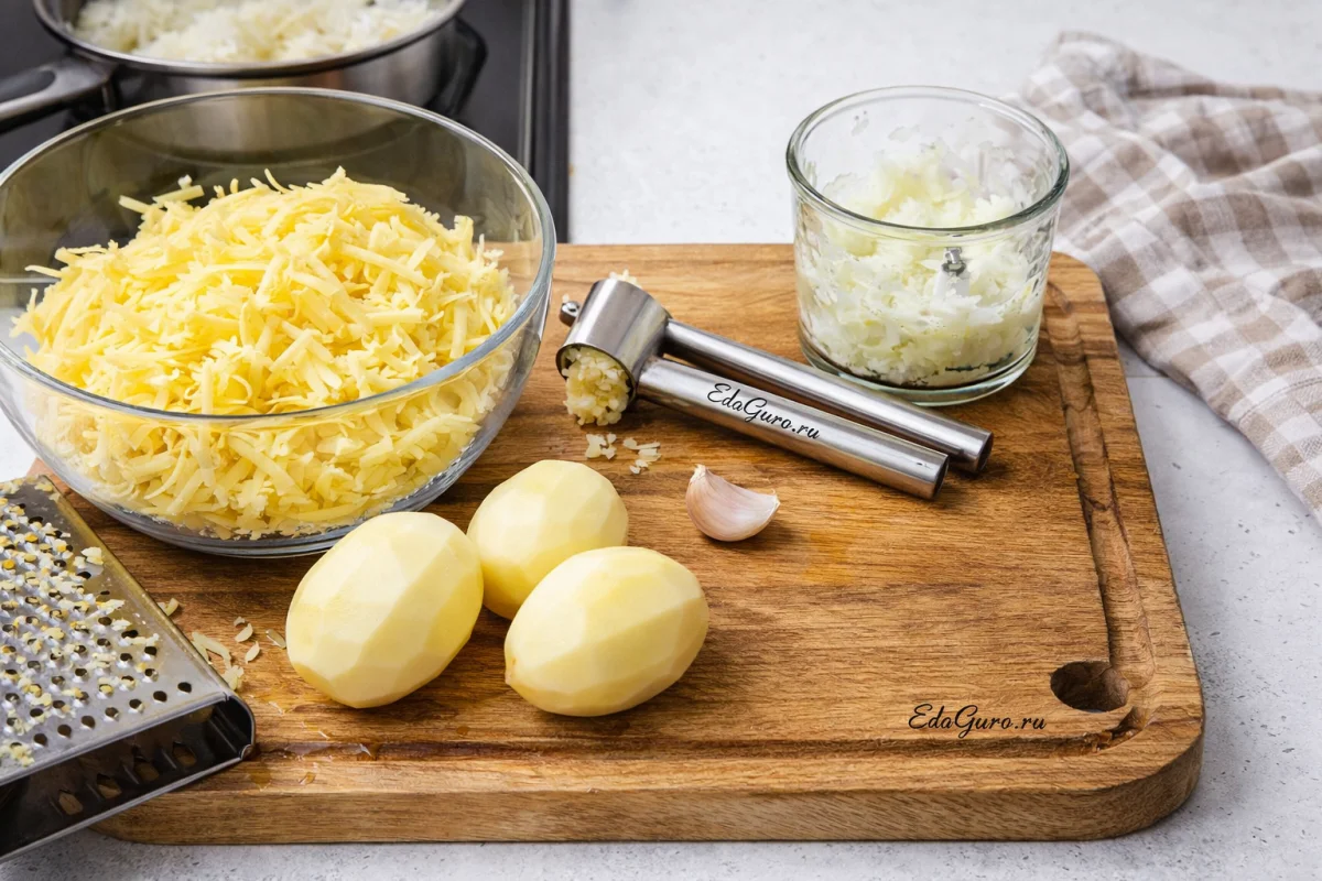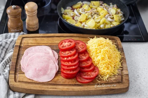 Смешайте тертый картофель с чесноком и луком, слегка посолите и хорошо перемешайте. Оставьте массу примерно на 10-12 минут. Пока она настаивается, нарежьте ветчину пластинами, томаты — кружками, а сыр натрите на крупной терке. Если помидоры слишком сочные, дайте лишнему соку стечь, чтобы начинка не получилась водянистой.