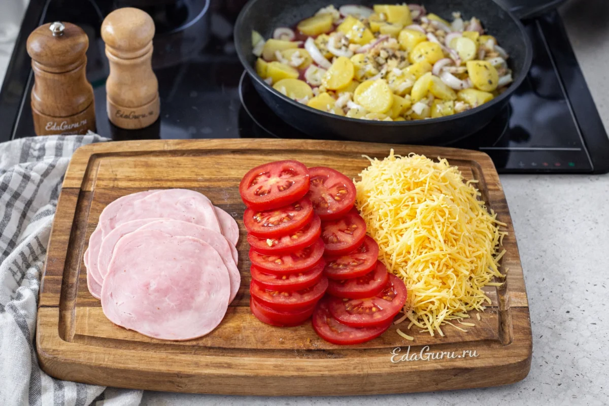 Разложите сверху ветчину и кружки томатов, затем посыпьте все твердым сыром. Уменьшите нагрев до минимального и накройте крышкой. Обжаривайте пиццы из картофеля еще примерно 10 мин. Следите, чтобы низ не подгорел: на слабом огне сыр успеет расплавиться, а начинка — прогреться.