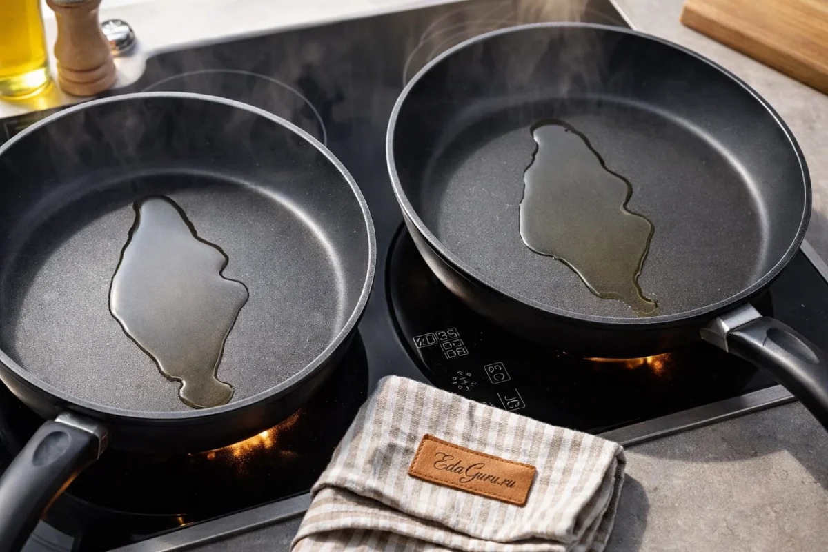 Жарить будем на 2-х сковородках. Поставьте их на слабый огонь и влейте масло. Дайте ему прогреться.