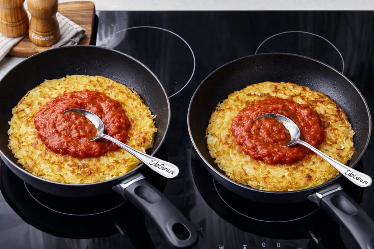 Разделите смесь из картофеля между сковородами, формируя на них ровные диски. Обжаривайте с одной стороны 6–8 минут, затем аккуратно переверните и распределите по площади диска томатный соус. Переворачивайте только после того, как низ хорошо схватится, чтобы пицца не развалилась.