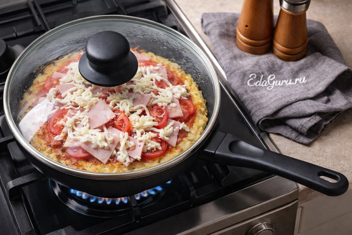 Пицца на картофельном тесте — практичный вариант домашней выпечки, в котором классическая идея пиццы сочетается с картофельной основой. Картофель давно используют в тесте и лепёшках в разных кухнях мира: он делает основу более мягкой и сытной. Такой способ особенно удобен, когда нет духовки или нужно приготовить блюдо быстрее. Сковорода позволяет получить румяную корочку снизу, а начинка успевает прогреться под крышкой. Для основы берут тёртый картофель, муку, яйцо и соль. Сверху добавляют соус, сыр, овощи, колбасу или грибы. Идея жарить лепёшки и открытые пироги на плите известна давно, а сама пицца исторически связана с итальянской традицией простых лепёшек с доступной начинкой. Картофельная пицца — это не классика Неаполя, а удобная домашняя интерпретация знакомого блюда.