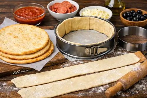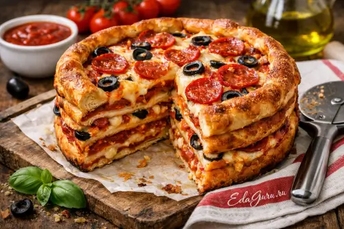 Многослойная пицца-торт — эффектная вариация пиццы, собранная из нескольких коржей с начинкой и сыром между слоями. Такой формат особенно популярен в домашней кухне США, где его часто называют pizza cake или layered pizza. По составу блюдо близко к глубокой пицце и запеканкам на основе теста: используют дрожжевое тесто, томатный соус, моцареллу, пепперони, овощи или фарш. Идея многослойной выпечки не нова: в итальянской традиции существуют закрытые и высокие пироги с начинкой, а в американской кухне давно развивались формы deep-dish pizza и stuffed pizza, особенно известные в Чикаго с XX века. Многослойная пицца-торт объединяет эти подходы: несколько пластов теста чередуют с начинкой, затем выпекают до расплавления сыра и румяной корочки. Главная особенность рецепта — плотная, «тортовая» подача и насыщенный вкус в каждом срезе.