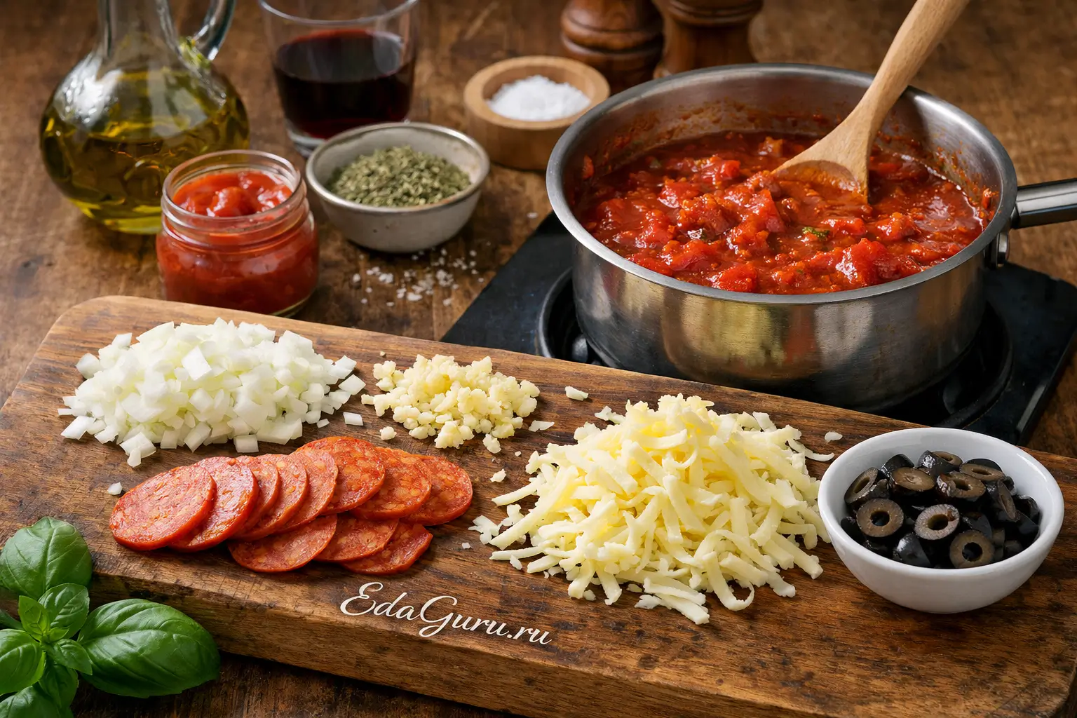 Пока тесто подходит, мелко нарежьте лук и чеснок. Обжарьте лук в оливковом масле до мягкости и легкой карамелизации, затем добавьте чеснок и томатную пасту. Через пару минут влейте красное вино, немного выпарите, после чего добавьте консервированные помидоры, итальянские травы, сахар и соль. Варите на слабом огне до густоты; при желании пробейте соус блендером. Одновременно подготовьте начинку: нарежьте пепперони тонкими кружками, моцареллу крупно натрите, оливки нарежьте колечками.