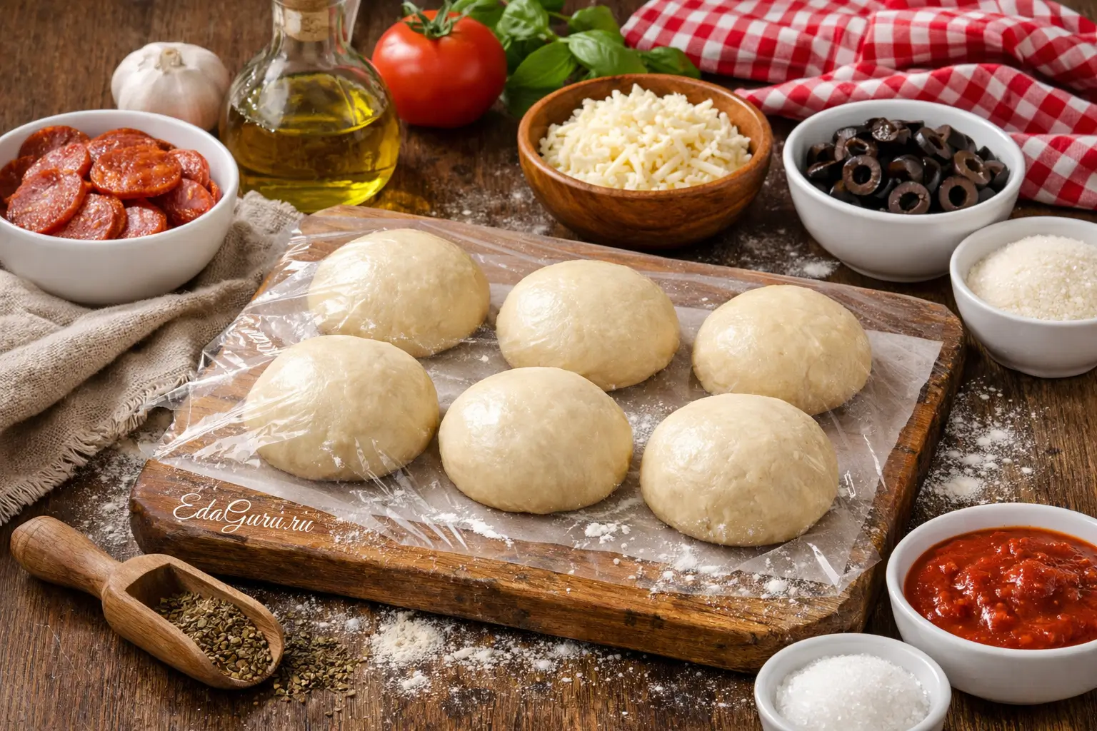 Подошедшее тесто обомните, разделите на 6 равных частей и скатайте в шары. Разложите их на расстоянии друг от друга, накройте пленкой и оставьте в тепле еще примерно на 1 час.