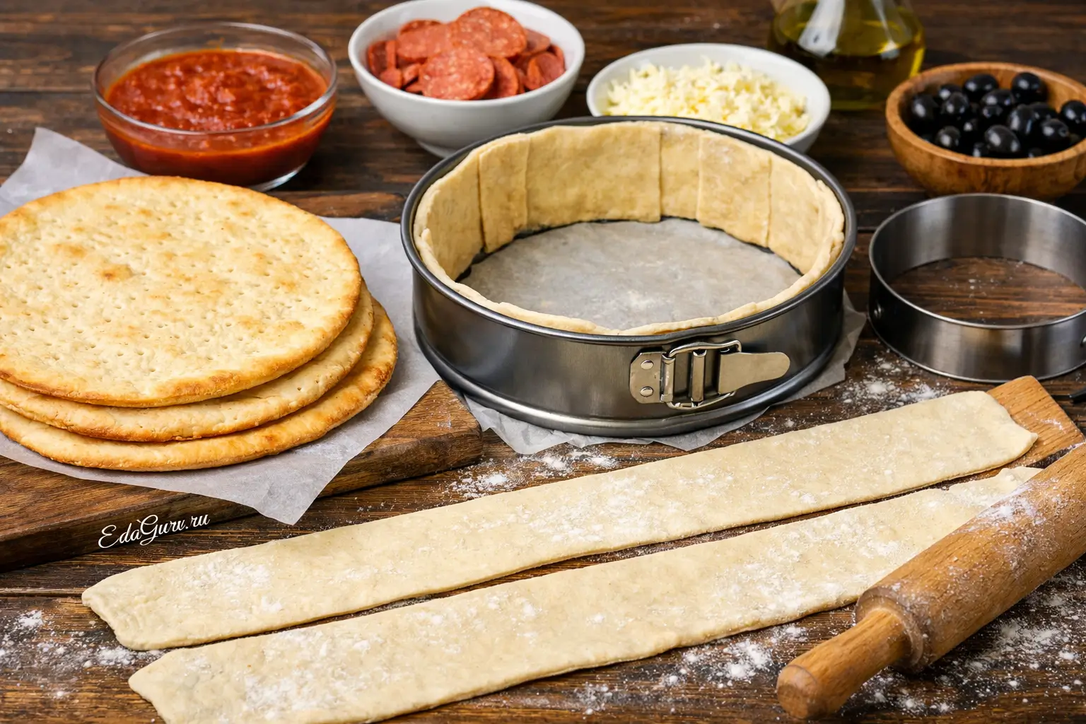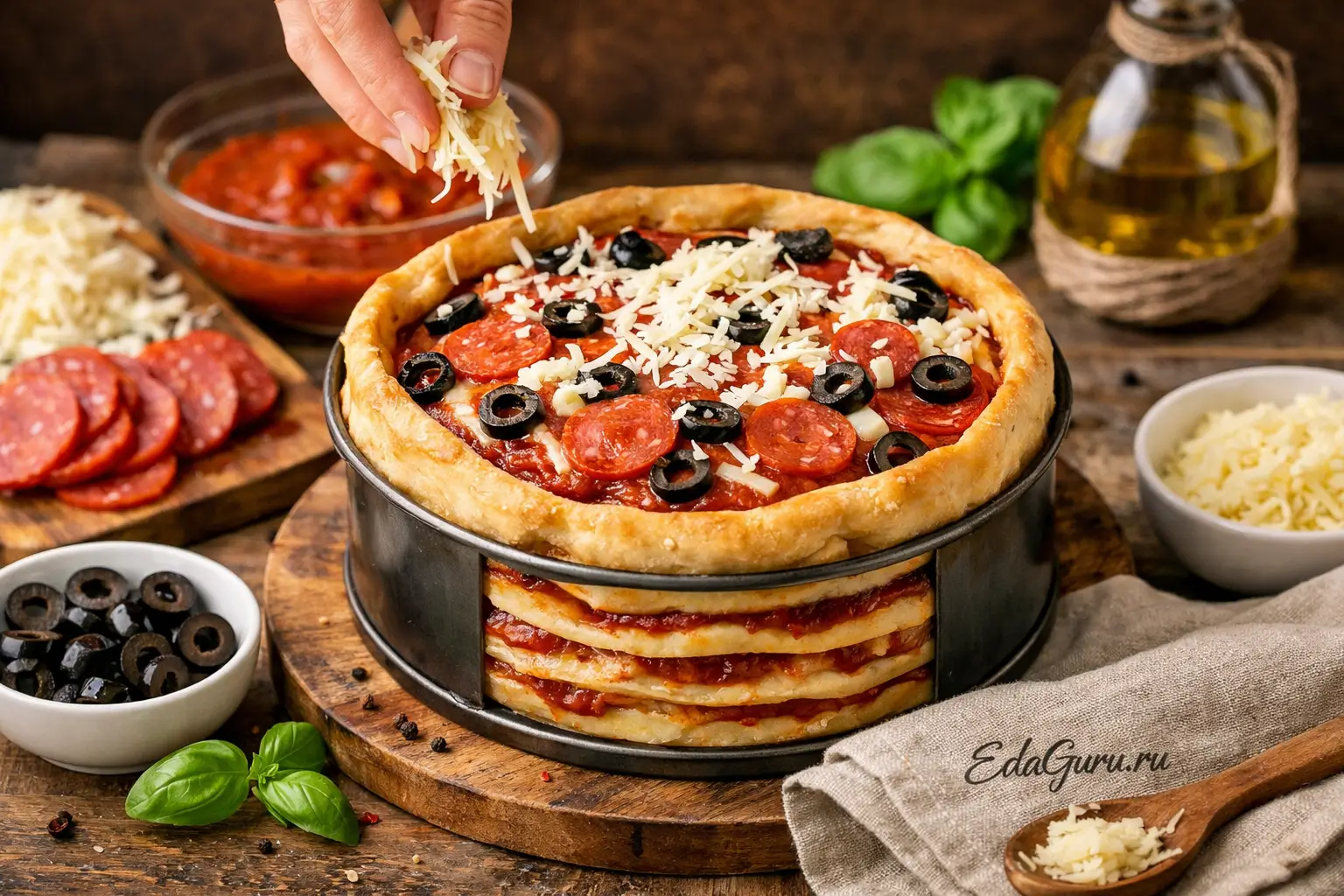 На дно формы уложите первый подпеченный корж и слегка прижмите. Начинку заранее разделите на 4 части. Смажьте корж соусом, посыпьте сыром, разложите колбасу, оливки и снова немного сыра. Повторяйте слои с оставшимися коржами и начинкой до самого верха, работая аккуратно, чтобы не повредить боковые стенки. Если коржи получились чуть больше, подровняйте их. Верхний слой смажьте соусом, подверните свисающее тесто наверх, сформируйте бортик и выложите остатки сыра, колбасы и оливок.