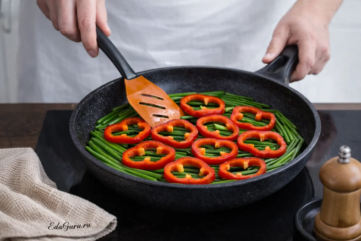 На разогретую сковороду с растительным маслом выложите перья зеленого лука, при необходимости подровняв их под размер сковороды, а сверху распределите кружочки перца. Жарьте на среднем огне 4-6 минут. Следите, чтобы овощи не подгорали: они должны слегка обжариться, а не пересушиться.