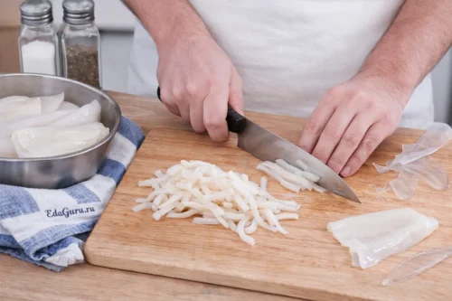 С филе кальмара снимите пленку с двух сторон и, если она есть, удалите хитиновую пластину. Затем нарежьте кальмара тонкой соломкой. Старайтесь резать полоски примерно одинаковой толщины.