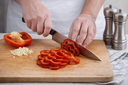 У сладкого перца удалите сердцевину, затем нарежьте его тонкими колечками поперёк. Чеснок очистите и мелко порубите. Если хотите более аккуратную нарезку, берите острый нож — так перец не будет мяться.