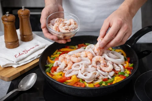 Сверху на перец разложите креветки и филе кальмара, не перемешивая. Продолжайте обжарку еще 3 минуты. Важно не передержать морепродукты, чтобы они остались мягкими и не стали резиновыми.