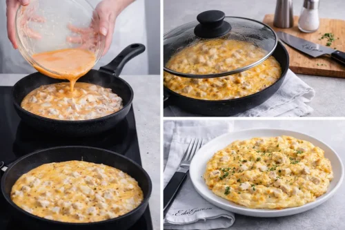 Сначала взбейте яйца с солью и мукой до однородности, затем равномерно залейте этой смесью содержимое сковороды. Готовьте 8–10 минут до полной готовности яичной массы; если нужно, накройте сковороду крышкой, чтобы верх быстрее схватился. Подавайте сразу, пока блюдо горячее.