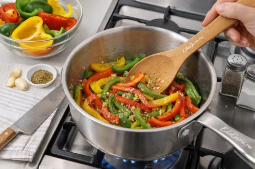 Перцы тщательно вымойте и почистите от семечек. Затем нарежьте их вдоль полосками шириной около одного см. Чеснок измельчите. В кастрюле с толстым дном разогрейте две ст. л. растительного масла, выложите полоски перца и чеснок, добавьте кумин, посолите и поперчите. Готовьте на слабом огне пять минут, периодически помешивая.