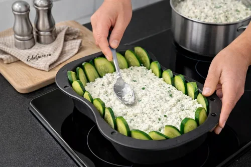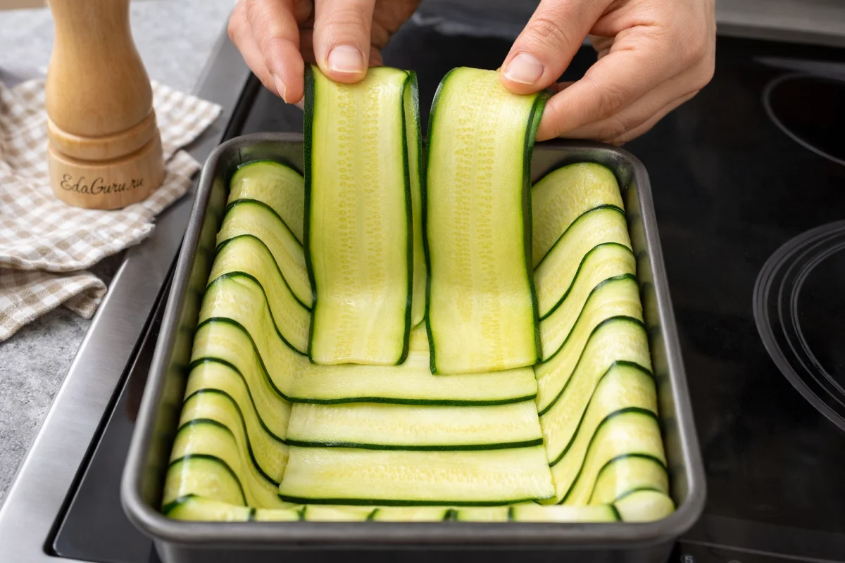 Полоски цукини укладывайте внахлест так, чтобы они полностью прикрывали и дно, и бортики прямоугольной емкости.