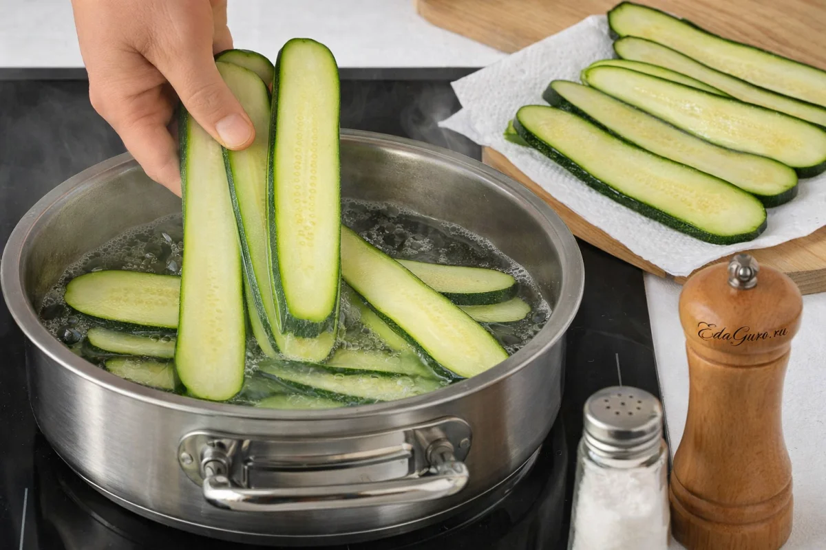 Цукини хорошо вымойте и, не снимая кожицу, нарежьте вдоль пластинами около 0,5 см толщиной . Затем опускайте их в кипящую подсоленную воду на одну минуту. После этого переложите пластины на салфетки, чтобы убрать лишнюю влагу. Старайтесь не передерживать цукини в воде, иначе они станут слишком мягкими.