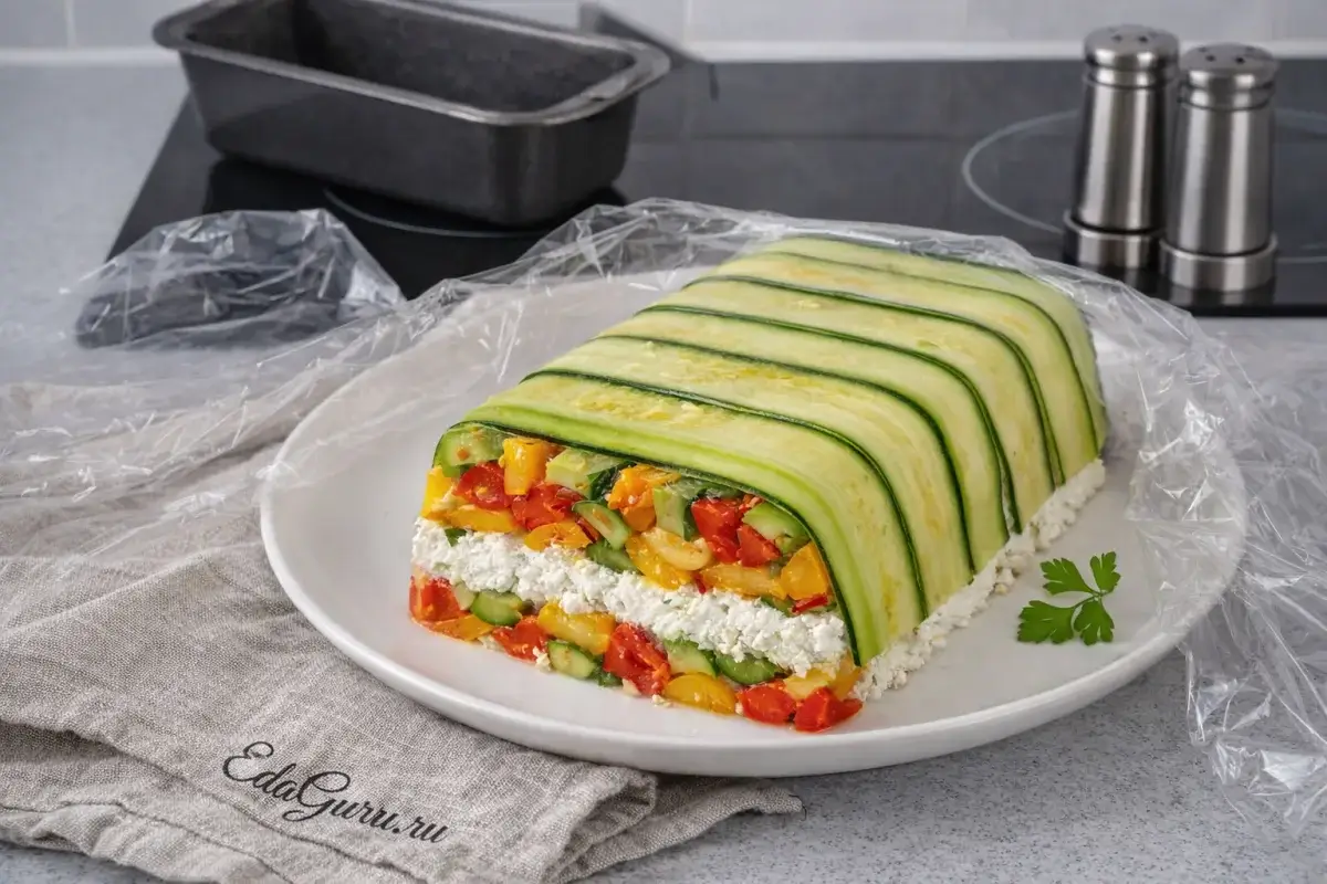 На слой творога ровно распределите половину перцев, обжаренных с чесноком. Сверху выложите вторую часть творога и закройте ее оставшимися перцами. Затем добавьте последнюю, третью порцию творога и аккуратно разровняйте верх. Накройте поверхность оставшимися полосками цукини, смажьте их остатками растительного масла. Форму накройте и уберите в холодильник на ночь, чтобы закуска хорошо схватилась. Перед подачей переверните форму на большое сервировочное блюдо и осторожно снимите ее. Закуску снова прикройте пленкой и держите в холодильнике до момента подачи.